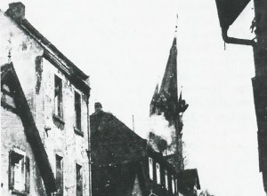 Alle Fenster mit Ausnahme des Mittelfensters wurden zerstört. Bilder aus dieser Zeit sind rar, da es verboten war, Ereignisse, die das System negativ darstellten, zu fotografieren. Eine Rarität ist der Abschuss der Kirchturmspitze durch die Amerikaner am 25. März 1945. Dabei wurden auch die Glocken und die Orgel getroffen.